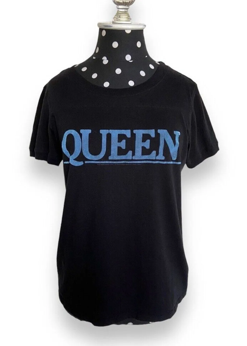 Bravado Womens Tee Sz M QUEEN Band Tee Black Blue Flocked 1980 The Game GENERALLY SHIP SAME OR NEXT DAY FROM FLORIDA!!! Show off your love for the legendary rock band Queen with this Bravado women's tee! Made from 100% cotton knit fabric, this slim-fit short sleeve tee features a crew neckline and pullover closure for easy wear. The black shirt with blue flocked lettering and accents adds a stylish touch to any outfit. Machine washable for easy care, this juniors' size M t-shirt is a must-have for any Queen fan. Perfect for wearing year-round, whether it's winter, summer, fall, or spring, this tee is versatile and comfortable. Add it to your collection of band merch and show off your love for the iconic group! Gently worn and washed Letters are flocked except for the back QUEEN which is sparkly About 23" long About 19" underarm to underarm