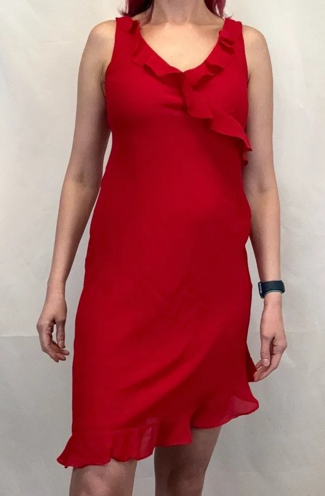 Breakin' Loose Women's Faux Wrap Asymmetrical Dress Vintage VTG 90s Sleeveless Tank Top V Neck Neckline Faux Wrap Bodice Pullover Pull On Fully Lined Short Length Mini Skirt Flutter Ruffle Hem Detail Knee Length Flowy Solid Color Casual Career Wedding Picnic Spring Summer Playful Whimsical Fun Boho Stunning Color: Bright Red Size: 9/10 Excellent Pre-Loved Condition: no rips, holes, tears, pulls or stains Comes from a smoke free home 100% Polyester Measurements in pics- let me know if you need more True colors may vary due to lighting or monitor/screen settings Offers welcome, no trades Same or next day shipping excluding Holidays