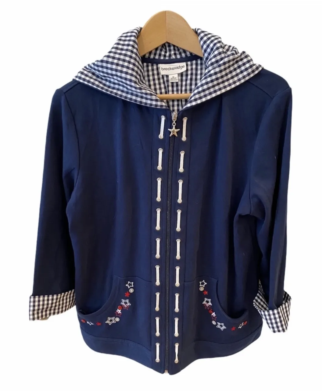 Love this vintage inspired zip up jacket. Navy blue with nautical rope detail by zipper. Stars, reminiscent of 4th of July, are embroidered by front pockets. Silver star zipper pull. Gingham lined hood and turn up cuffs on arms. Arm cuffs have a stitch holding its shape/position. You can snip and have a longer sleeve. Relax fit. Sweatshirt feel Excellent condition Measurements are approximate Bust 41 Length 23 Sweatshirt, hoodie, preppy, gingham, country, cottagecore, nautical, casual, breckenridge, retro, vintage, coastal gradmother, patriotic, plaid, Fourth of July, USA, cozy, relaxed fit, beach, holiday