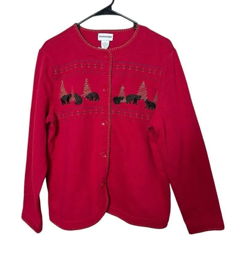 Breckenridge Sweater Cardigan Red Brown Bear Embroidered Gold Stitch Trim M. Great condition. Button... Show more