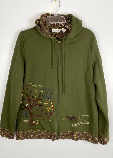 EXCELLENT CONDITION; NO SIGN OF WEAR * BRAND: Breckenridge * Size: Large * The Breckenridge Zip Up Hoodie features a charming paisley pattern and an embroidered horse print, adding a touch of preppy farm style to your wardrobe. * The colors are green, magenta, and yellow--earth tones * The zip-up design offers convenience and ease of wear, making it a practical choice for various casual occasions. * With its combination of classic paisley and equestrian-inspired embroidery, this hoodie is a versatile and stylish option for those who appreciate a blend of traditional and contemporary elements in their clothing. * Materials: cotton/polyester * Machine wash APPROX., FLAT LAY: * Underarm-to-underarm: 22" * Shoulder-to-hem: 25.5"