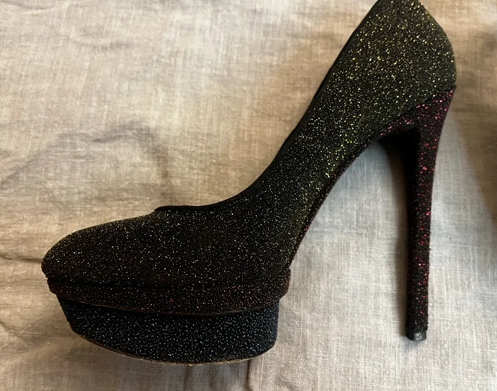 Brian Atwood Fontanne Shoes Gold Red Blue Glitter Heels Platform Black Size 8.5 - $86 - From Jacqueline