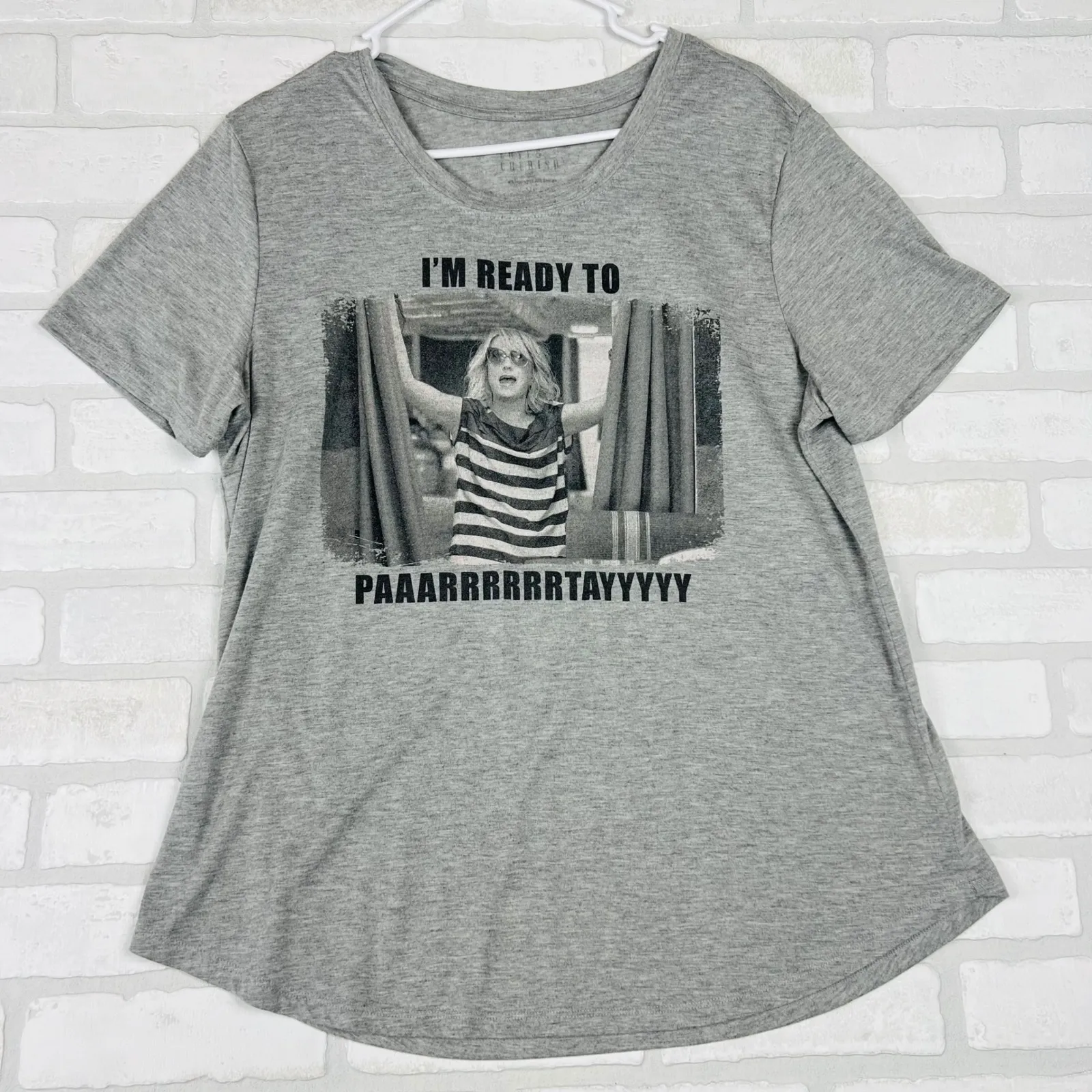 A fun and quirky t-shirt for fans of the hit movie Bridesmaids. This gray tee features a graphic of bridesmaids in her iconic 'I'm Ready To Paaarrrrrtayyy' scene. Its casual style makes it a comfortable everyday shirt. Keywords: Bridesmaids, PAAARRRRRRTAYYY, T-Shirt, Gray Tee, Womens Top, Funny Shirt, Comedy TV Show, Casual Wear, Graphic Tee, Party Shirt, XL Size 21" chest, 27" length, 1625, 4.7