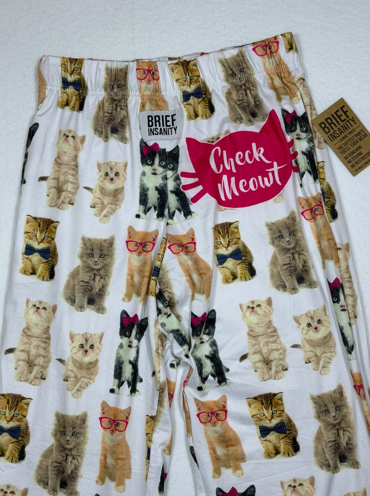 Embrace ultimate comfort and playful style with these Brief Insanity lounge pants. Featuring an adorable all-over print of kittens in various poses, some sporting cute glasses and bowties, these pants bring a smile to your face. The soft fabric and comfortable elastic waistband ensure a relaxed fit for lounging at home or sleeping soundly. Measurements: • Waist: 13 in • Inseam: 31 in Style: Sweatpants Department: Women Material: Polyester, Spandex Leg Style: Straight Type: Pants Fabric Type: Microfiber Features: Elastic Waist, Lightweight, Wrinkle Resistant Closure: Pull On Pattern: Animal Print Accents: Bow Theme: Cat, Funny Occasion: Casual Waist Size: 30 in Fit: Relaxed Rise: Mid (8.5-10.5 in) Keywords: pajama pants, lounge wear, sleepwear, cat print, kitten pattern, cozy, soft, comfortable, gift, nightwear, whimsical, fun print