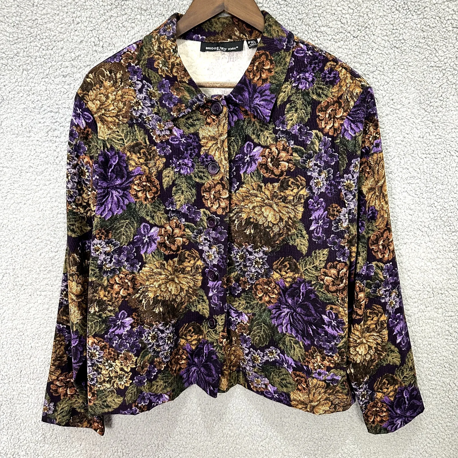 Briggs New York Blouse Womens PXL Floral Corduroy Button Up Dark Academia Retro Excellent vintage condition. No major flaws noted. Vintage-inspired floral corduroy blouse by Briggs New York in a rich fall palette of purple, olive, rust, and gold. Features a collared button front and soft velvety ribbed texture. Perfect for layering with dark academia and retro wardrobes. Petite XL. dark academia, retro, vintage, fall fashion, cottagecore, floralcore, maximalist, boho, grandmacore, artistic, statement #DarkAcademia #RetroFloral #VintageBlouse #CottagecoreStyle #FallFashion