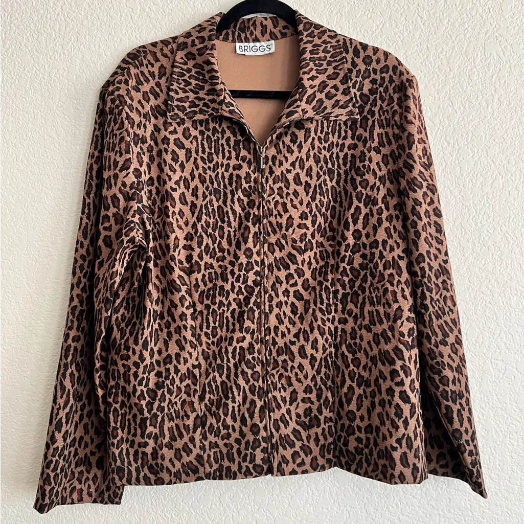 Briggs leopard print zip jacket in XL. Animal print statement piece with mob wife aesthetic, perfect for bold layering. Preowned excellent condition. Clean, with no flaws or damage. Packaged with care. Ships same or next day. Offers welcome. Bundle and save! Pit to Pit 20” relaxed / 22” stretched zipped Full Length: 26” ladybugthreads FEUT8