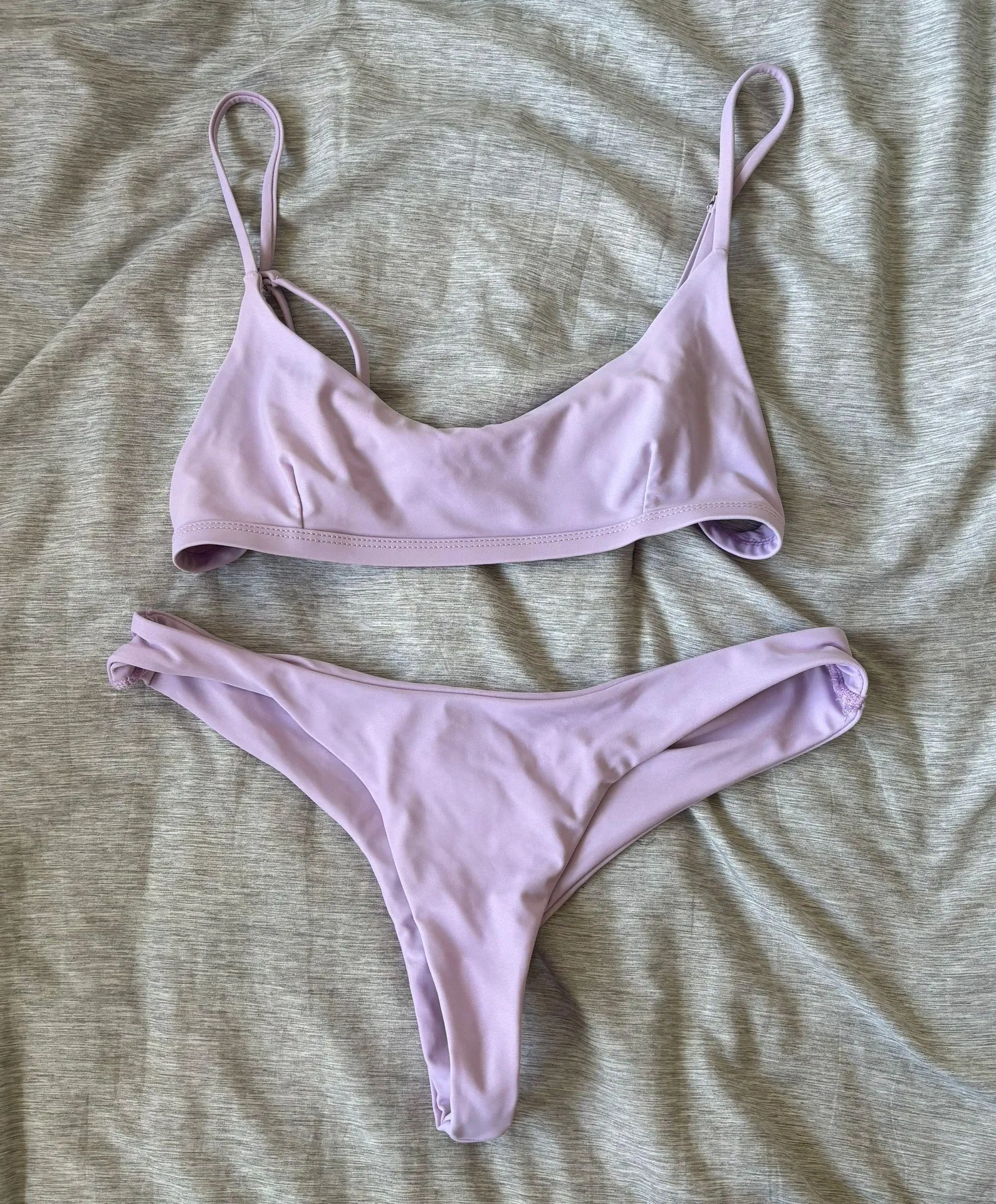 Bright Swimwear purple bikini set! Thong style bottoms that ride high on the hips and a swoop style bikini top. Never worn :) Size Large but I’m a 32C and waist size 25” and it fits pretty well! Super unique lilac color too 💜 Bought on here super cute just didn’t fit, size medium but fits like a small