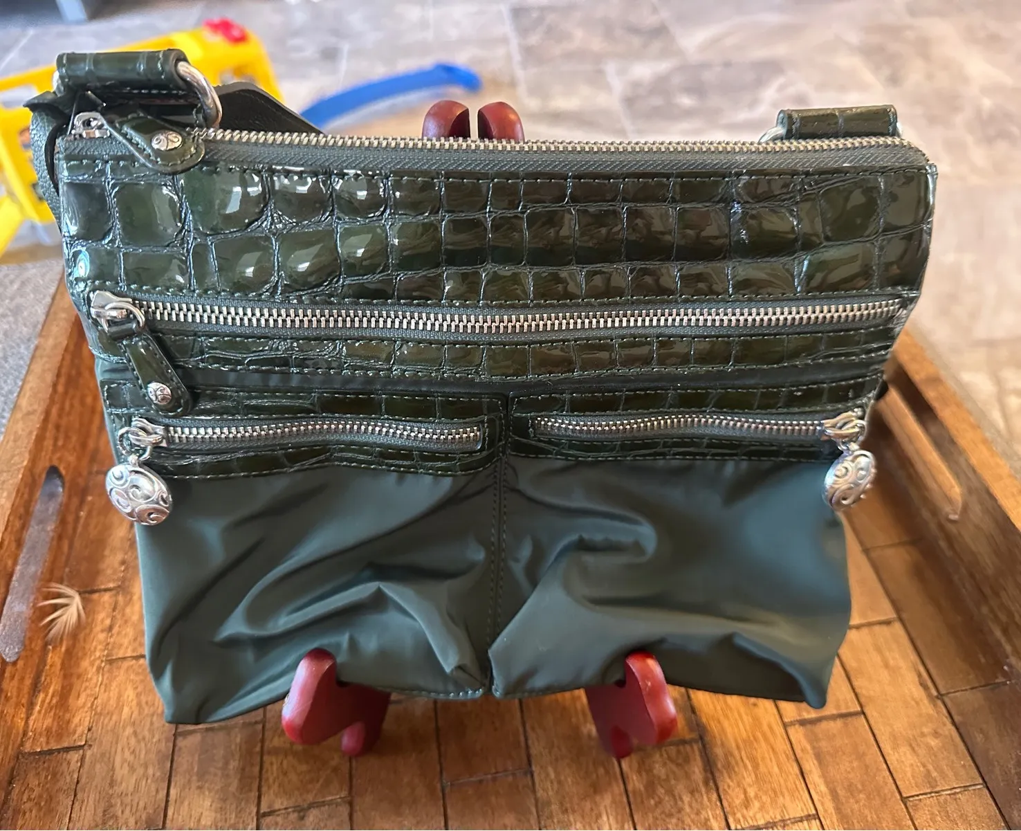 Keywords: Brighton, crossbody bag, olive green, faux crocodile, adjustable strap, heart charm, silver tone hardware, nylon, shoulder bag, designer bag, stylish, casual, accessories, women's fashion