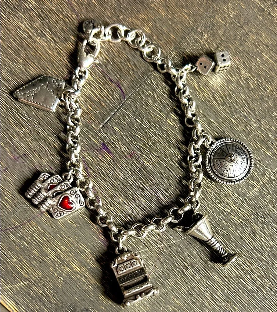 Elegant silver charm bracelet featuring playful red accents. Perfect for adding a touch of whimsy to... Show more