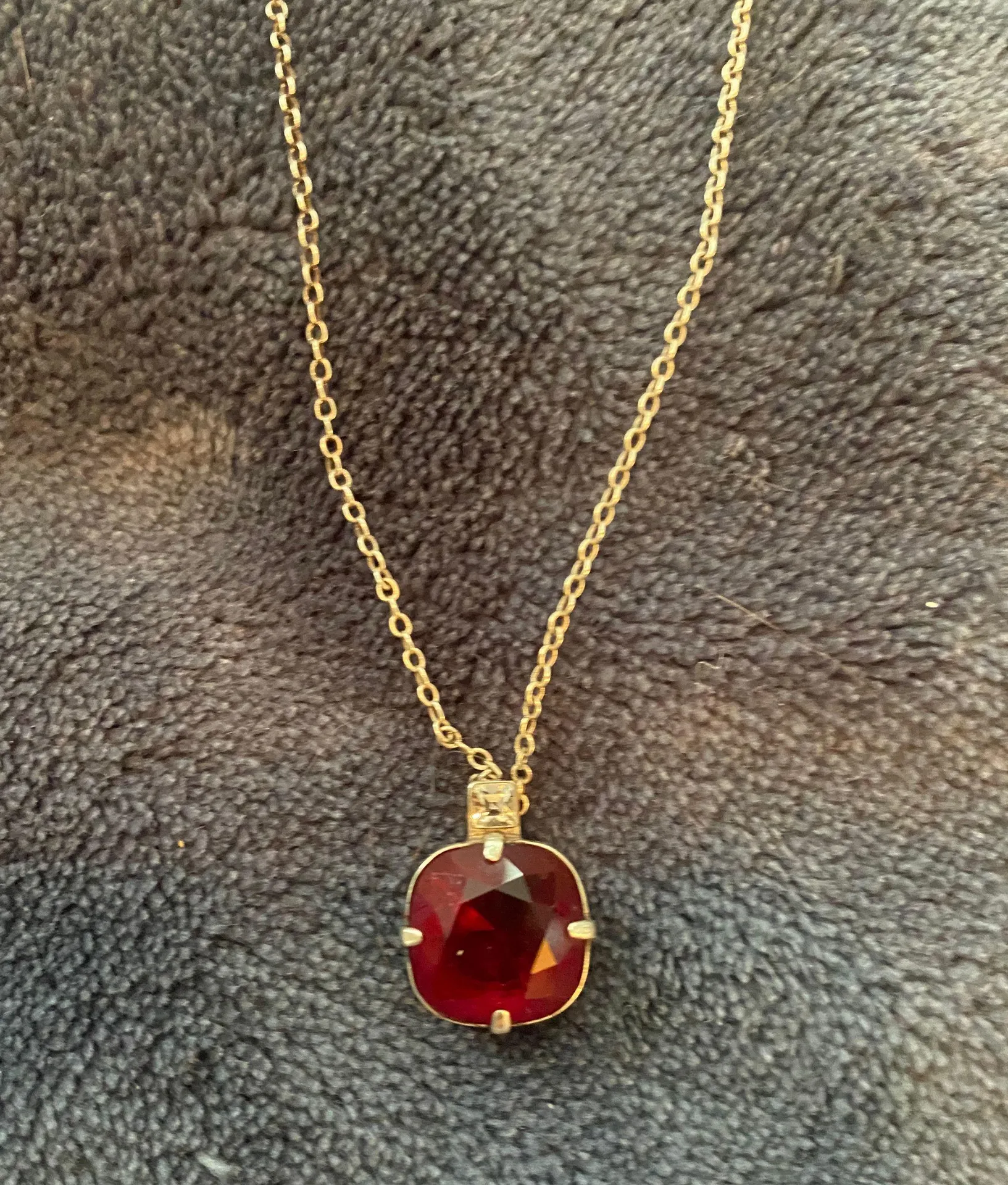 ✨ Red/Burgundy gem with a small diamond above the gem on a silver chain. ✨ Good condition. Great ne... Show more