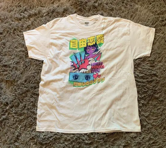 Sgt. Pepper can’t compare to this shirt! This Lonely Hearts Club t-shirt from Brisco features a colorful graphic, reminiscent of 90s shojo anime. The shirt is made out of 100% cotton. The shirt would look great with a pair of cut off shorts! The shirt is NWOT, but does have some flaws. These flaws include two holes on the back of the collar where tags used to be, small white dots on the purple girl (these seem to be manufacturing errors), a part of the last kanji on the top is missing some yellow in the design (again, this seems to be a manufacturing error), and other such manufacturing flaws, however, these flaws do not hurt the look of the t shirt. The price is negotiable. If you have any questions please do not hesitate to ask! Measurements: Pit to pit: (from the front) 22.8 inches Length: 29.9 inches Tags: t shirt, otaku, nerdy, colorful, summer, anime, animecore, hearts, heart, anime t shirt, animecore t shirt
