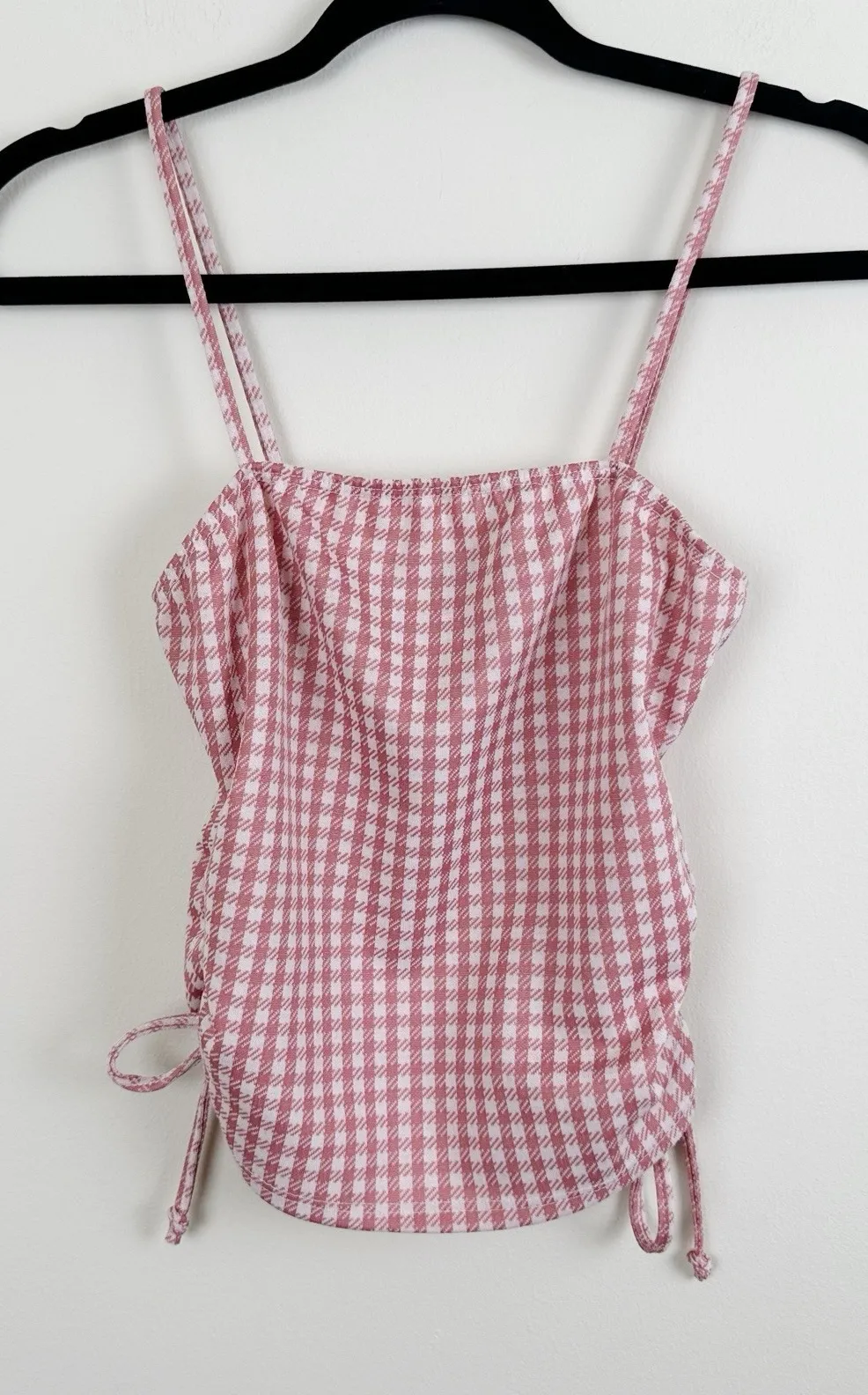 Cute and stylish Brit & Bri women's tank top in a pink and white gingham check pattern. Features adjustable ruched sides with ties and thin spaghetti straps. Lightweight and stretchy material—perfect for summer or layering. We ship out same business day and are happy to answer your questions!