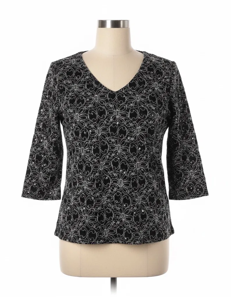 Brittany Black XL Black Silver Sparkle Floral Lace Top Blouse Y2K Fairy Grunge Type: Blouse Department: Women Neckline: V-Neck Sleeve Length: 3/4 Sleeve Sleeve Type: Classic/Fitted Sleeve Accents: Glitter Pattern: Floral Features: Stretch Fit: Regular Sparkle, Glitter, Metallic, Floral Print, Scroll, Sheer Overlay, Stretch, Stretchy, Mesh, V-Neck, 3/4 Sleeve, Y2K, 90s, Vintage, Retro, Grunge, Fairycore, Fairy Grunge, Whimsigoth, Goth, Gothic, Alternative, Dark Academia, Evening, Party, Holiday, Club, Cocktails Measurements are Approximate: Length 23" Armpit to Armpit 19" New without Tag. Please see photos for measurements, condition and details. All items are shipped promptly. (7322)