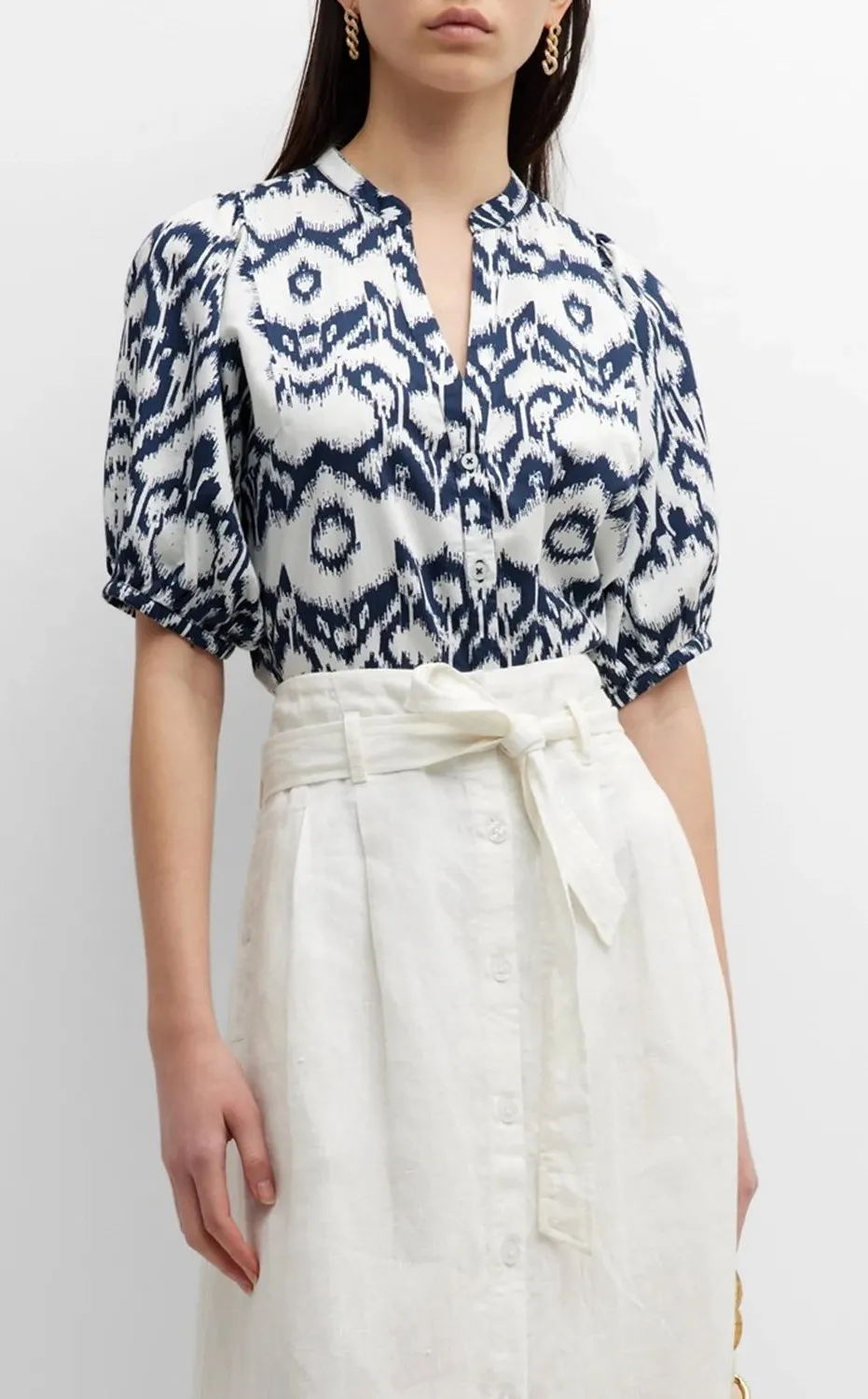 Brochu Walker Asteria button down blouse in a striking navy and white ikat print. This top features... Show more