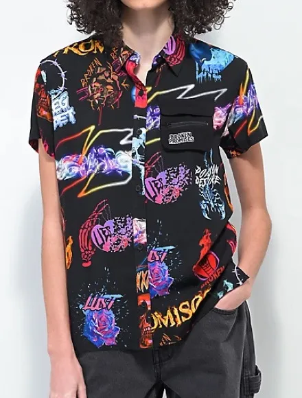 The Simulation short sleeve button up shirt from Broken Promises has a black colorway brandished wit... Show more