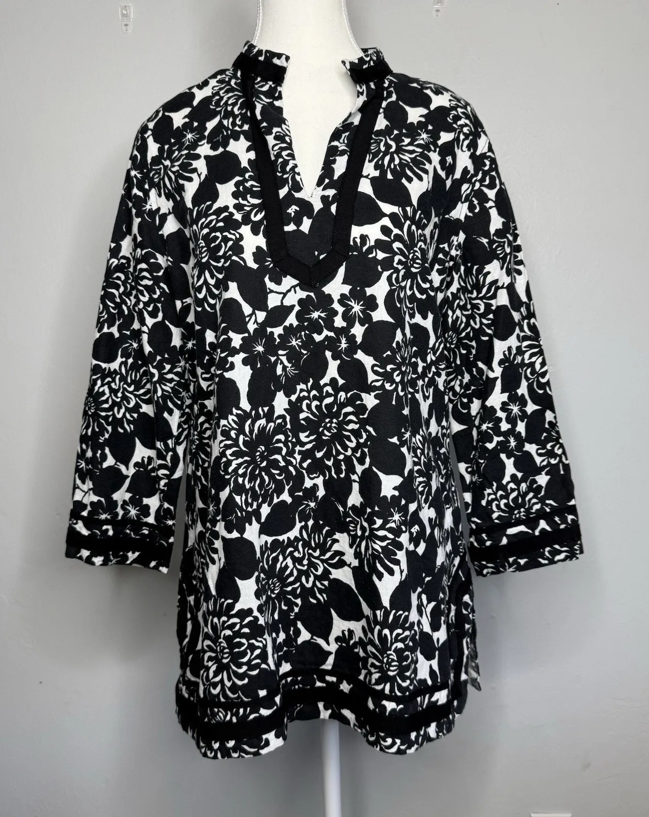 Chic and lightweight, this Brooks Brothers tunic blouse features a bold black and white floral print in a breathable linen/cotton blend. Designed with a split V-neckline and 3/4 sleeves, it’s the perfect mix of classic, polished, and comfortable. Great for spring, summer, resort wear, or as a stylish beach cover-up. Details: • Brand: Brooks Brothers • Size: Large • Color: Black & White Floral • Style: Tunic / Blouse / Top • Neckline: Split V-neck with trim • Sleeves: 3/4 length • Fabric: 55% Linen, 45% Cotton • Care: Machine wash cold, line dry • Made in India Approx Measurements (laid flat): • Armpit to armpit: 21” • Sleeve length (from shoulder): 19” • Length (shoulder to hem): 28.5” Condition: Gently worn, no major flaws. Beautiful quality linen blend—perfect for everyday wear, vacation, beach cover-up, or casual chic styling! Feel free to ask any questions or make an offer!