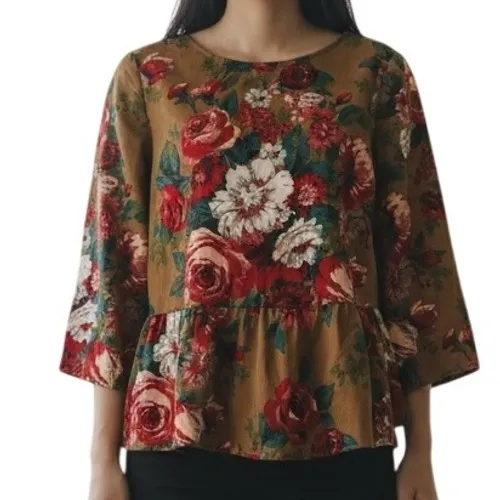 Embrace timeless charm with this captivating floral blouse, a true testament to effortless style. Its rich brown canvas bursts with a vibrant bouquet of blooming roses in passionate reds and delicate whites, creating a visually stunning statement. The flattering peplum silhouette adds a touch of feminine flair, gently flaring to create a beautiful, flowing shape that moves with you. Crafted with meticulous attention to detail, this blouse offers a delightful texture and a look that is both sophisticated and whimsical, promising to become a cherished piece in your wardrobe. Condition: Excellent Size 6 Measurements: • Chest (pit to pit): 36 in • Length (shoulder to hem): 24 in • Sleeve length (shoulder to cuff): 17 in Type: Blouse Department: Women Material: 100% Cotton Machine Wash Neckline: Round Neck Sleeve Length: 3/4 Sleeve Sleeve Type: Flared Sleeve Pattern: Floral Accents: Peplum Theme: Peasant, Classic Features: Lightweight Fit: Regular Keywords: Brooks Brothers Red Fleece, Floral Blouse, Women's Top, Peplum Blouse, Rose Print, Brown Blouse, 3/4 Sleeve, Casual Top, Charming Blouse, Feminine Style, Boho Chic, Garden Print, Vintage Inspired, Flowy Blouse