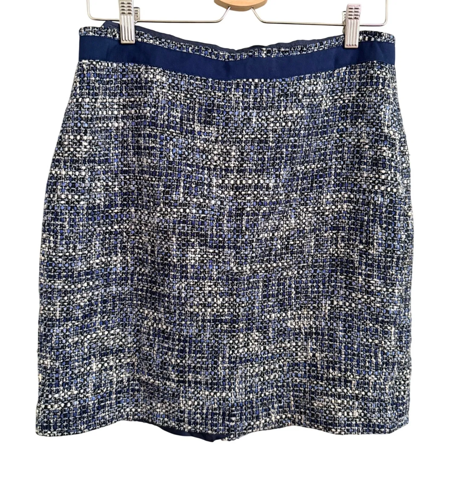 Elevate your wardrobe with this sophisticated Brooks Brothers tweed skirt, a testament to timeless style and impeccable craftsmanship. Feel the luxurious texture of the woven fabric, designed to drape beautifully and flatter your silhouette. The classic blue, white, and black color palette offers versatile styling options, making it a perfect choice for both professional settings and chic evenings out. Imagine yourself confidently presenting in a board meeting or enjoying a delightful dinner date, this skirt is sure to make a memorable impression. Its refined design and comfortable fit ensure you look and feel your best, effortlessly transitioning from day to night. Type: Skirt Style: Straight & Pencil Skirt Length: Knee Length Department: Women Material: Polyamide, Wool, Cotton Blend, Viscose, Cotton Fabric Type: Tweed Features: Lined, Pockets Closure: Zip Occasion: Business, Workwear Keywords: Brooks Brothers skirt, tweed skirt, women's skirt, size 10 skirt, blue tweed, business casual, work skirt, professional attire, classic skirt, designer skirt, wool blend skirt, sophisticated style, tailored skirt, fashionable skirt, chic skirt