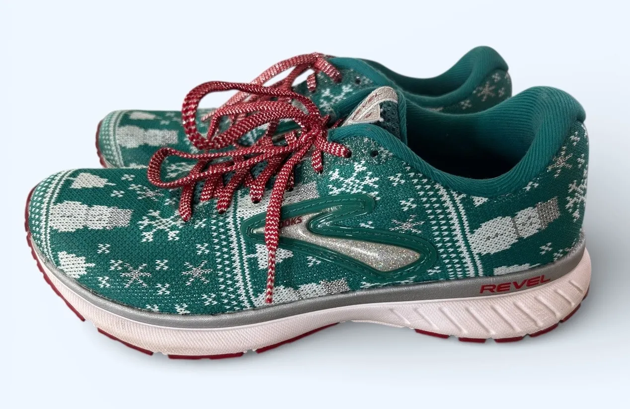 Fun and festive Brooks Revel 3 running shoes featuring a holiday-inspired knit upper in green with r... Show more