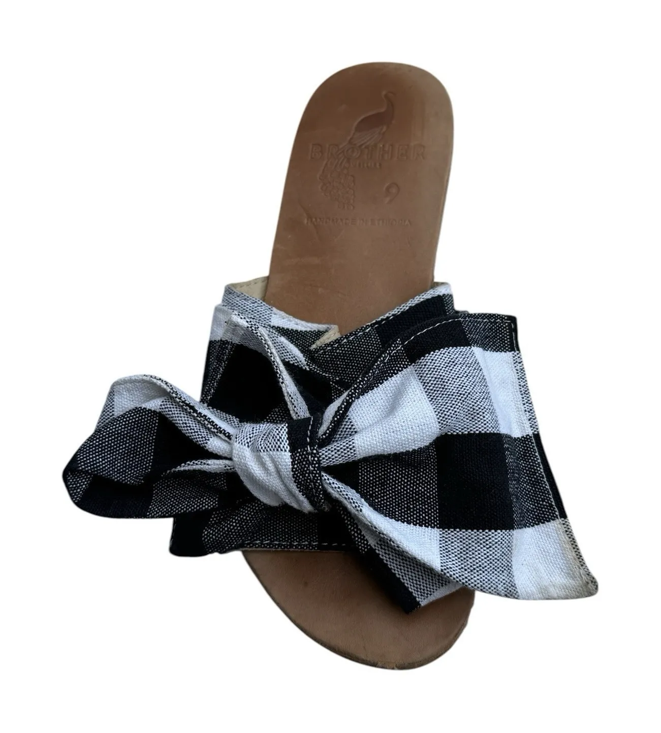 Elevate your summer style with these black and white checked leather sandals from Brother Vellies. The Burkina model features a slip-on design with a comfortable and breathable fabric upper, perfect for travel and casual occasions. The flat heel style and minimal cushioning level make them ideal for a day at the beach or a walk in the park. These handmade sandals are designed with a bohemian, ethnic, and peasant theme, adding a touch of festival and hippie vibe to your outfit. The accent bow and checked pattern make them a stylish choice for any outdoor or Aloha-themed event. With a US shoe size of 9 and M shoe width, these sandals are perfect for women who love comfortable and stylish footwear. 2228. Garage