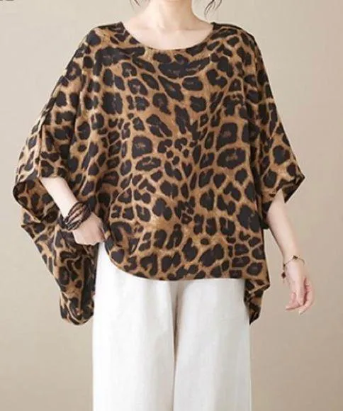 Woman’s Leopard Oversized OSFM Flowy Blouse Elegant Date Night Cocktail Hour Summer Wedding (Guest) Fun Pit to Pit 25.5 inches Front Length 25.5 inches Back Length 27 inches B2-0256