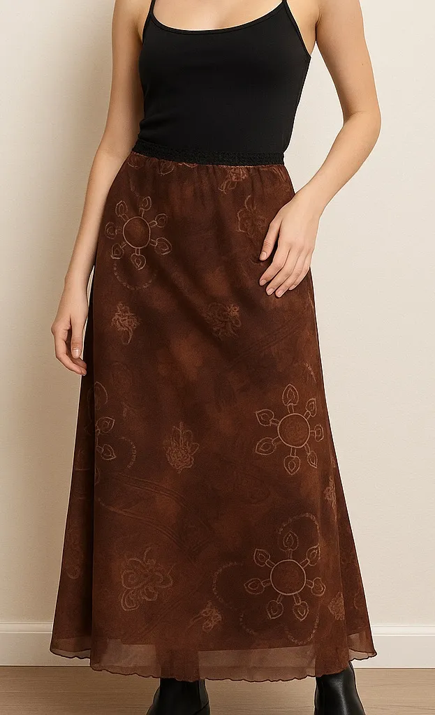 Beautiful vintage boho-inspired brown maxi skirt featuring a flowy silhouette and a semi-sheer printed overlay with floral and paisley motifs. The waistband is finished with delicate black lace trim, adding a soft feminine touch. Lightweight, airy, and perfect for year-round styling. This piece gives a strong 90s/Y2K bohemian vibe, ideal for pairing with tanks, knits, or boots. Details: • Maxi length • Brown + tan tonal floral/paisley pattern • Black lace waistband • Sheer mesh overlay with lining • Flowy, easy fit • Great pre-loved condition Measurements: • Waist (unstretched): ~13” • Waist (stretched): ~16” • Length: Maxi Fits S–M depending on desired fit and stretch. A perfect piece for lovers of boho, festival, gypsy, Y2K, earthy aesthetic, cottagecore, soft grunge, and unique vintage skirts. Keywords: boho maxi skirt, vintage brown skirt, lace waistband, paisley skirt, sheer overlay skirt, Y2K skirt, festival clothing, earthy aesthetic, hippie skirt, 90s boho, patterned maxi skirt, mesh skirt