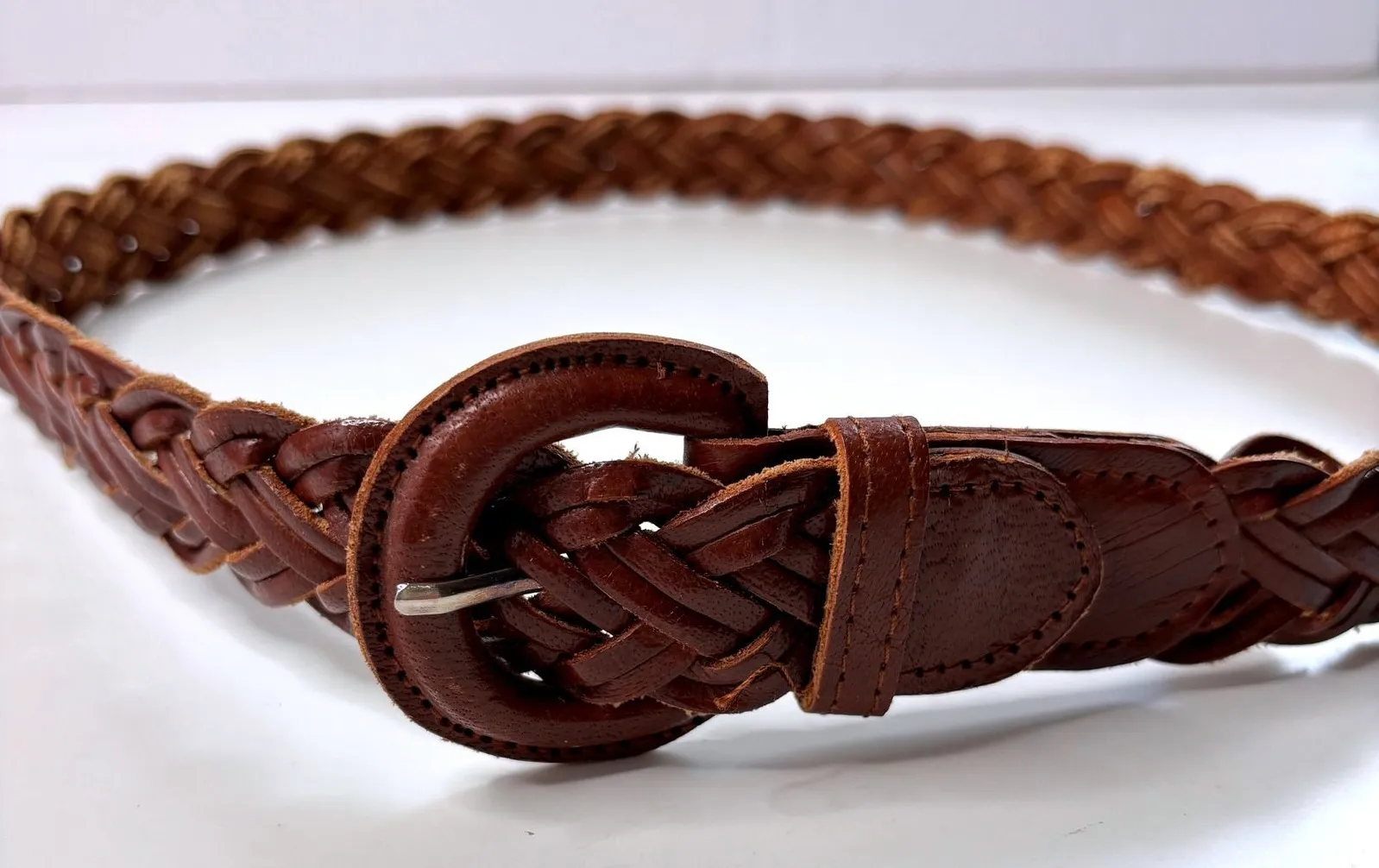 Brown Leather Braided Belt Buffalo Leather Woven Boho Hippie Western Large VTG Keywords: braided belt, woven belt, brown leather belt, buffalo leather, boho belt, hippie belt, western belt, large belt, women's belt, leather accessories, fashion belt, handmade belt, vintage belt, braided leather, belt Please see photos for details.