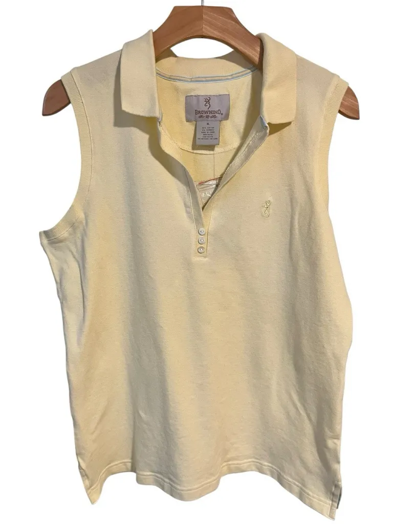 In brand new with tags condition. There are no issues or flaws. Top of shoulder to bottom hem measurement is approximately 26 inches. Armpit to armpit measurement is approximately 21 inches. This Browning Sleeveless Top in size XL is a stylish addition to any woman's wardrobe. The yellow V-neck tank shirt features a button-collared design, making it perfect for casual occasions during the summer, fall, and spring seasons. The lightweight fabric blend of spandex and cotton ensures comfort and easy care, while the embroidered Browning logo adds a touch of outdoor and classic style to the basic top. Perfect for those who appreciate a preppy look with a hint of outdoor adventure. Item9253