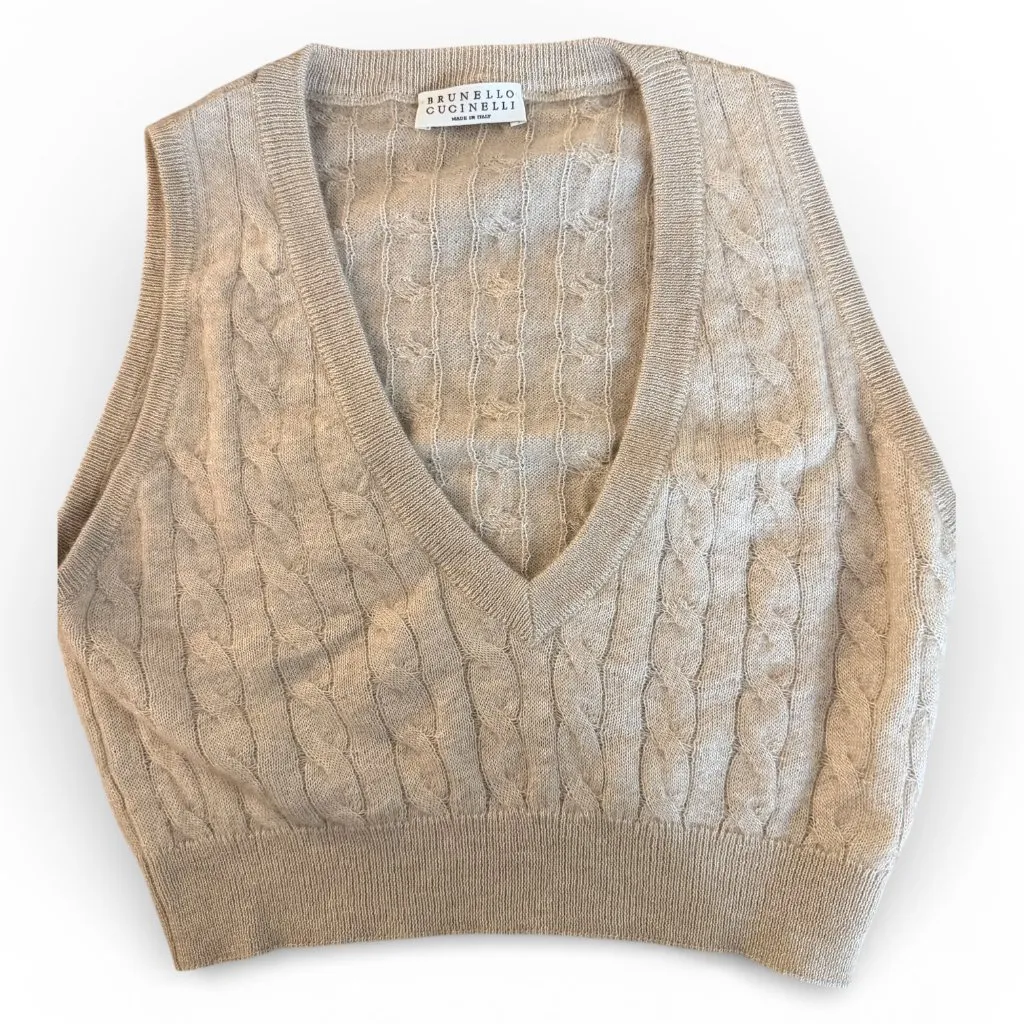 MSRP$790 Brand new Brunello Cucinelli cable knit sweater vest in a refined beige neutral, featuring the brand’s signature monili (micro-diamond/bead) embellishment along the upper back neckline for a subtle, elevated sparkle. Crafted in Italy from a luxurious alpaca and cotton blend, this vest features a classic V-neck silhouette, intricate cable knit texture, ribbed trim, and discreet jewel detailing that catches the light beautifully without being flashy. An iconic Brunello piece that blends timeless tailoring with quiet luxury craftsmanship. Details: • Signature monili / diamond bead detail at back neckline • V-neck • Cable knit construction • Ribbed hem and arm openings Fabric: • 50% Alpaca • 50% Cotton Made in Italy