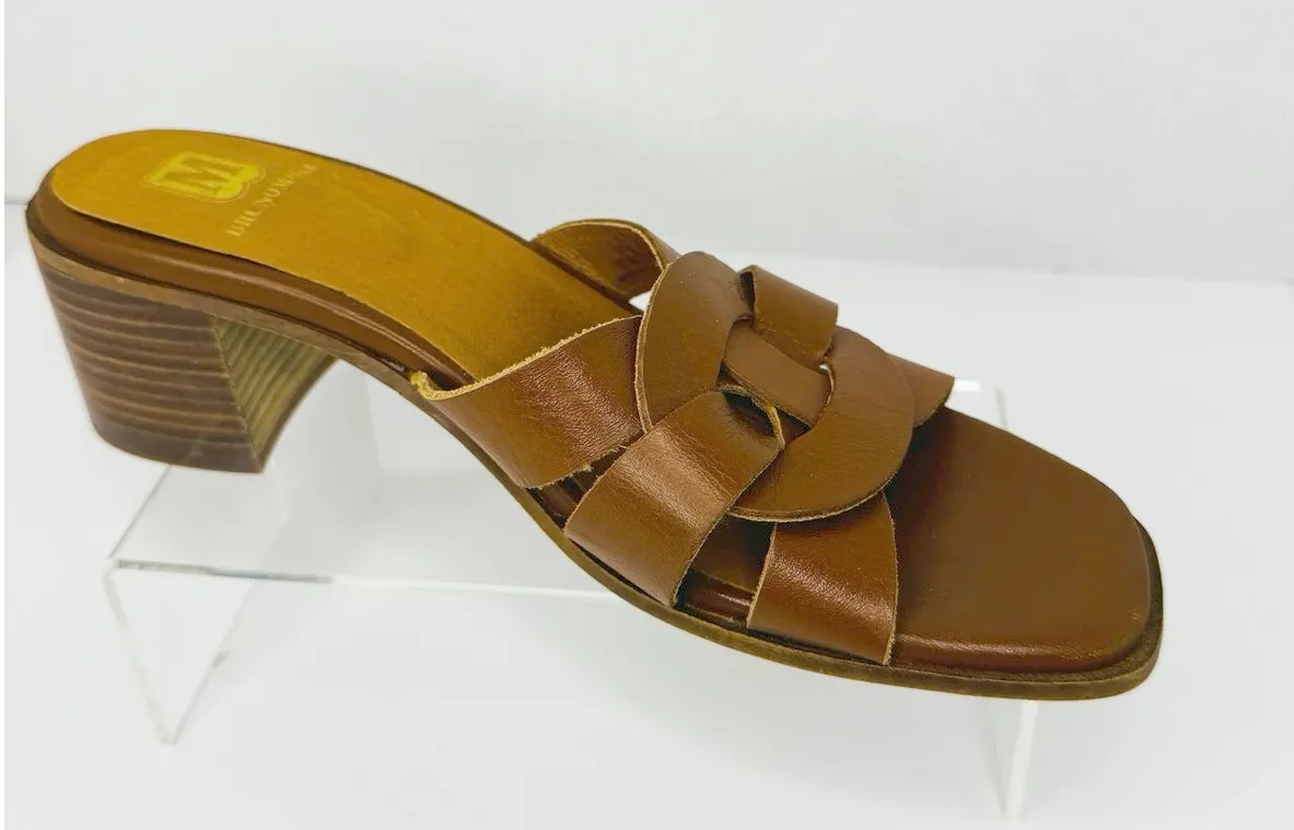 Bruno Magli Leather in Rich Cognac Block Heel Slide Sandals – Size 40 Good used condition for some minor scuffing on the from- also some residue on bottom soles • Color: Rich cognac/tan brown • Material: Smooth leather upper with interwoven strap detail at the vamp • Toe: Square open toe • Heel: Stacked block heel (approximately 2.5–3 inches) • Design: Slip-on mule style with a bold, circular interlock strap motif Measurements are approximate tags: fall, autumn, winter, cool weather, boho, bohemian, mini, tiered, ruffle, fit & flare, long sleeve, date night, night out, event, evening, special occasion, cocktail, dinner, career, business, work, workwear, professional, fashion, fashionable, trendy, wedding, bride, trendsetter, ootd