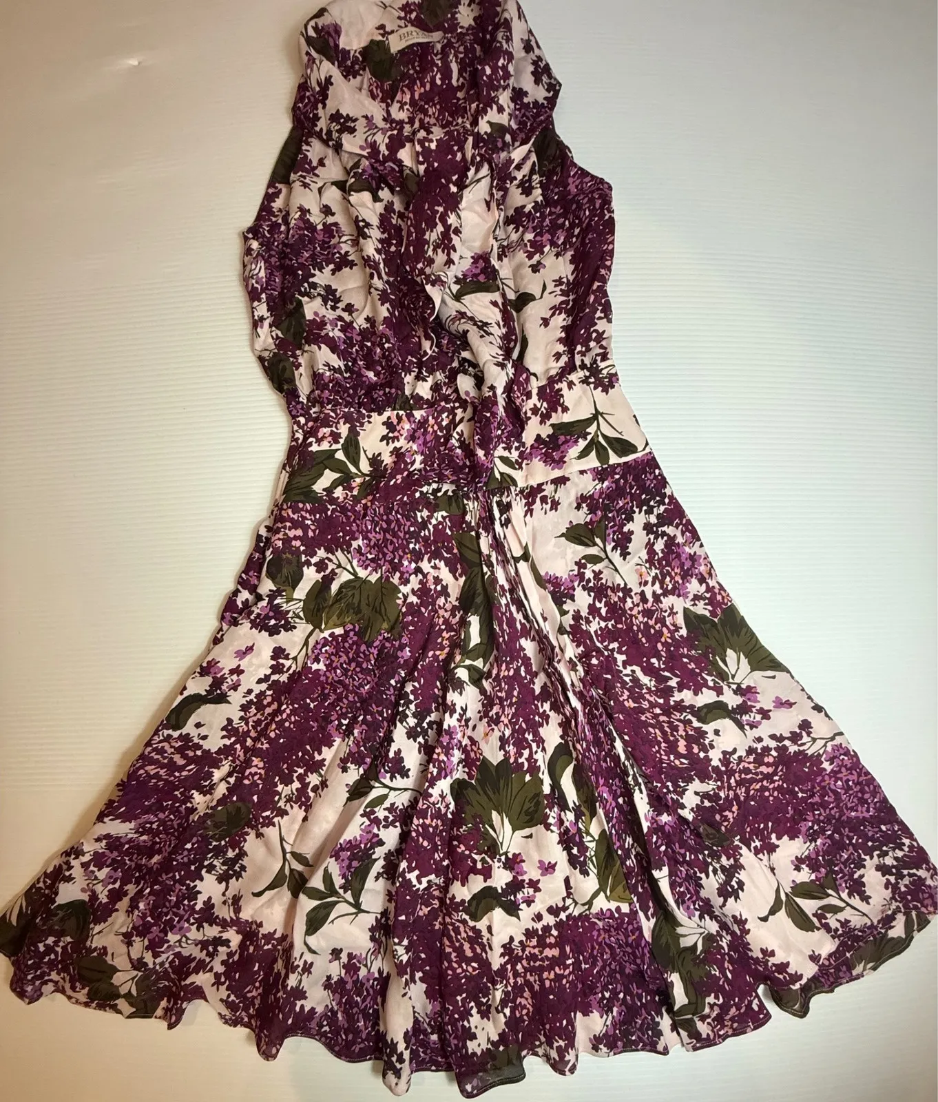 Elegant sleeveless dress featuring an eye-catching purple and green floral print. This dress showcases a flattering fit-and-flare silhouette, perfect for accentuating the waist and creating a feminine shape. Crafted from luxurious 100% silk, it offers a soft and comfortable feel against the skin. Its sophisticated design makes it suitable for garden parties, bridal showers, or a romantic dinner date. Measurements: • Length: 31 inches • Waist: 15 inches Style: Fit & Flare Dress Length: Knee Length Color: Purple Department: Women Sleeve Length: Sleeveless Pattern: Floral Occasion: Party/Cocktail, Wedding, Casual Material: Silk, 100% Silk Character: Floral, Boho, Elegant, Feminine, Romantic Fabric Type: Woven Season: Spring, Summer Sleeve Type: Strapless Closure: Tie No size tag Keywords: floral dress, silk dress, sleeveless dress, purple dress, green dress, fit and flare dress, bryan bradley, designer dress, cocktail dress, party dress, summer dress, spring dress, floral print, silk, wedding guest