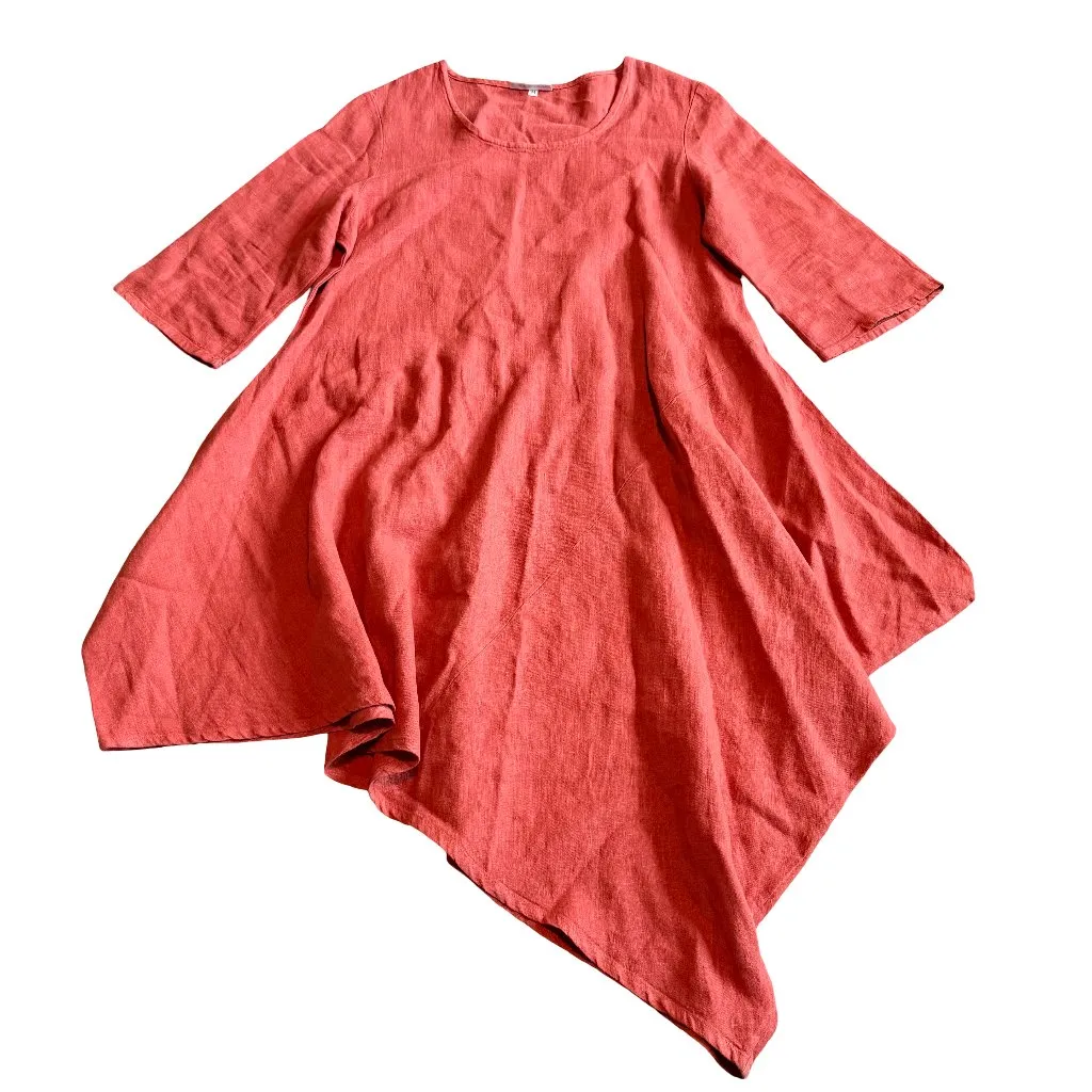 Bryn Walker Size medium women's US 100% linen organic mini dress Flowy asymmetrical handkerchief hem; 3/4 length sleeves Crew neck; So comfortable and flattering! 100% linen Measurements taken across the front when laying flat: Bust: 23", Length: 34" - 49", Sleeve length from neck: 21" In excellent condition; no stains, holes or flaws I am always open to offers - bundle & save!