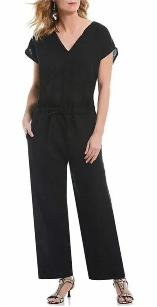 Bryn Walker 100% LINEN JUMPSUIT Size Large Cinched Waist Short Sleeve Black Euc. No flaws. Drawstrin... Show more