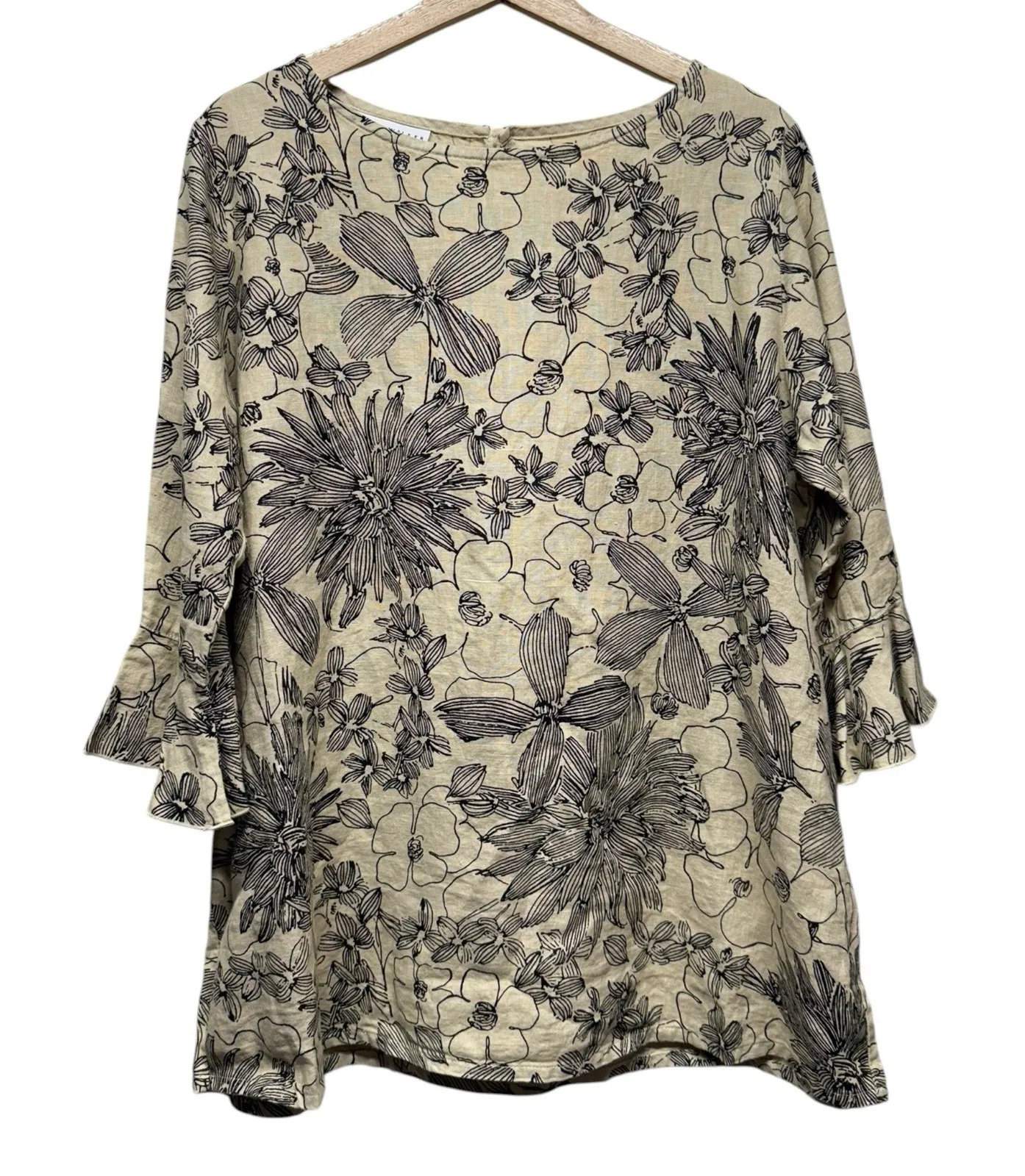 Excellent condition Pit to pit 23 in Length 29 in 3/4 Sleeve, ruffle bell sleeve Round neck Beige/black floral Tags: lagenlook, floral, boho, bohemian, coastal, resortwear, beach, casual, feminine,