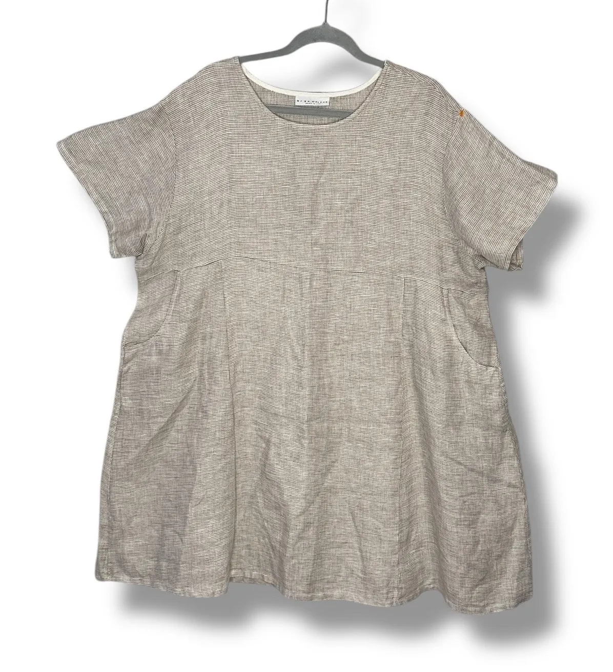 Effortless style begins with this linen-blend dress, a study in relaxed sophistication. Simple yet refined, this piece offers a comfortable and flattering silhouette, perfect for warm weather days. The dress features a classic round neckline and short sleeves that add a touch of ease. Practical side pockets enhance its functionality, while the clean lines maintain a minimalist aesthetic. The subtle texture of the linen blend adds depth and visual interest. Ideal for a casual brunch, a summer picnic, or a relaxed day exploring the city. Style: T-Shirt Dress, Shift, A-Line, Sundress Dress Length: Midi Color: Beige Department: Women Sleeve Length: Short Sleeve Pattern: Striped Occasion: Casual, Travel Material: Linen Blend Neckline: Round Neck Character: Boho, Minimalist, Casual, Relaxed, Effortless Fabric Type: Woven Season: Spring, Summer, Fall Keywords: Bryn Walker dress, linen dress, short sleeve dress, beige dress, pocket dress, womens dress, casual dress, midi dress, summer dress, boho dress, minimalist dress, comfortable dress, relaxed fit dress, linen blend dress, medium dress