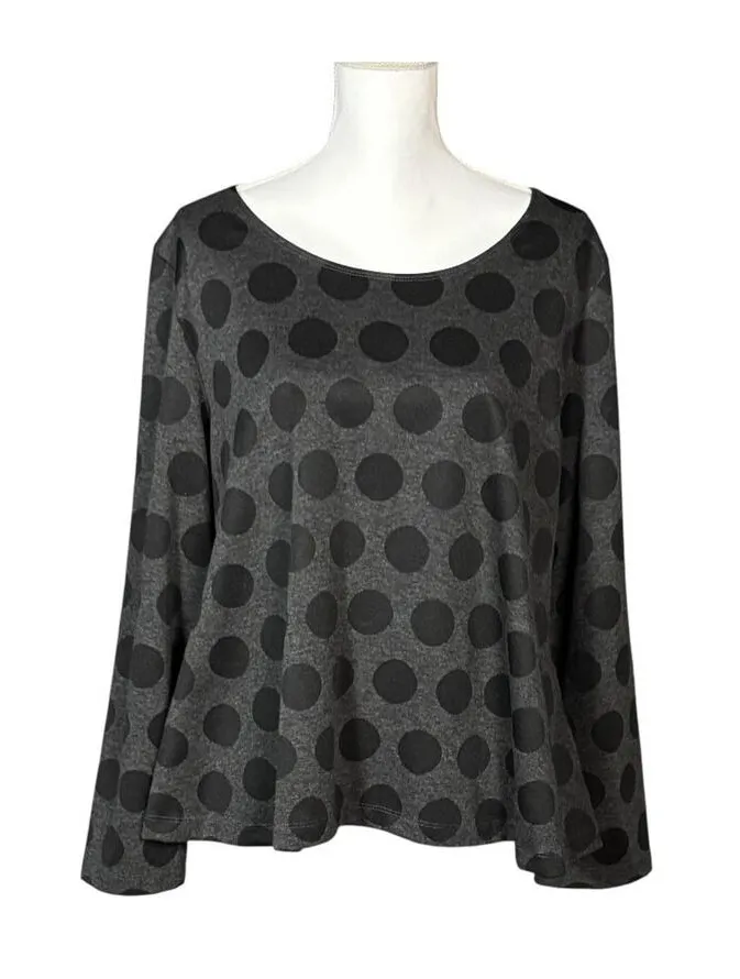 All over polka dot print Boat neckline Pullover styling Long sleeves Made in the USA Length - 25.5" Across chest - 22.5" Top is in excellent pre-owned condition without any blemishes Ships from a smoke-free and pet-free environment Trusted seller; ships quickly Packaged with care Artsy, Lagenlook, Abstract, Relaxed, Comfortable, Comfy, Polished, Timeless, Work, Weekend, Everyday