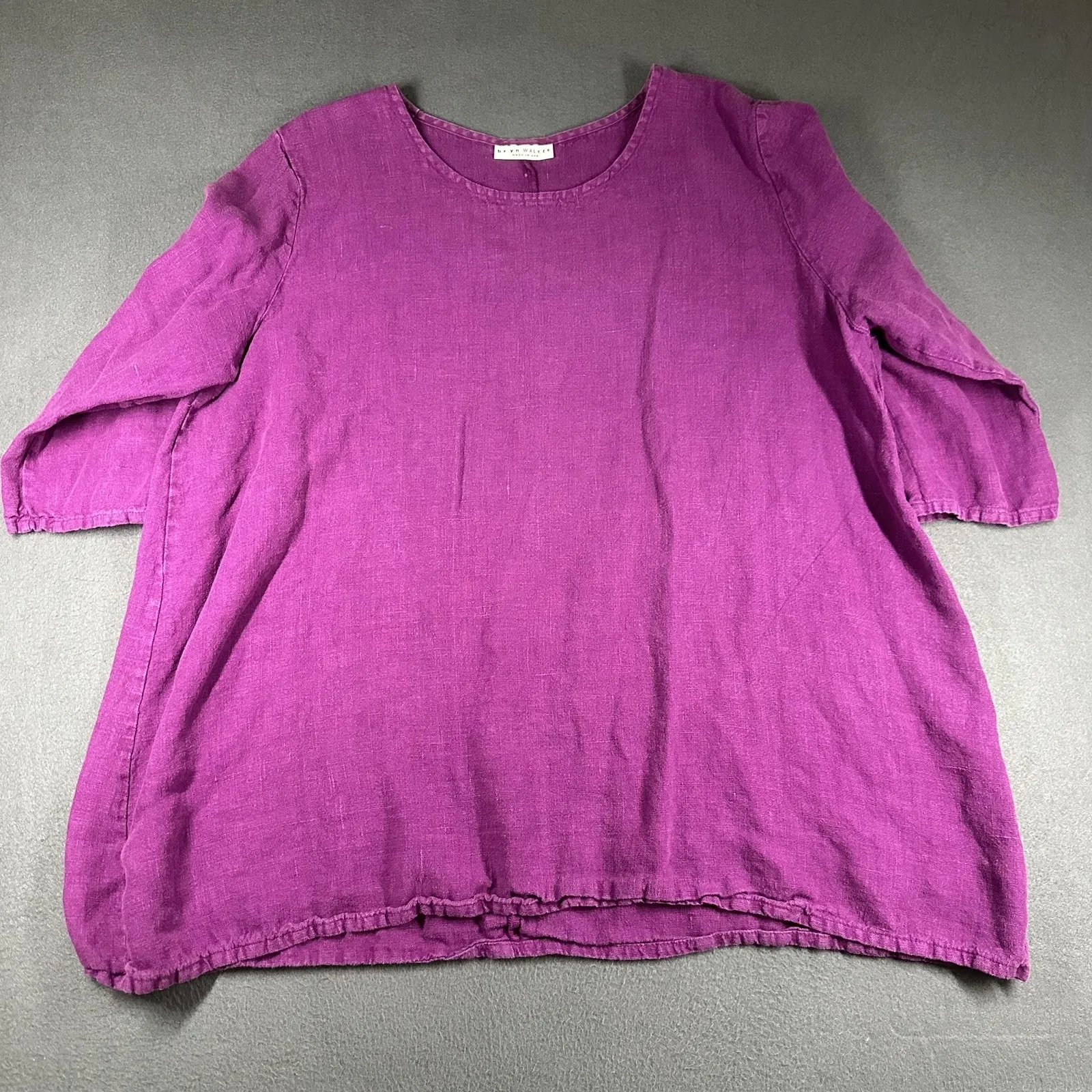 Armpit to armpit - 26.5" Shoulder to hem - 29" Smoke free, dog friendly home. 1166GO14F03 Brand: Bryn Walker Type: Women's relaxed fit linen tunic top with scoop neckline and 3/4 length sleeves. Color: Rich purple solid. Size: Womens XL (per interior size label at back neck). Material: 100% linen; made in U.S.A. Fabric: Lightweight woven linen with natural slub texture, designed to drape softly and provide breathable comfort. Details: Scoop neck, 3/4 sleeves, straight hem with subtle crinkled finish, and center back seam construction. Features: Easy pull-on styling, breathable natural linen fabric, relaxed tunic silhouette that pairs well with leggings, jeans, or casual pants. Label/codes: Bryn Walker neck label and interior fabric/care label with RN 58880 (per tag). Care: Machine wash warm on gentle cycle, do not bleach, tumble dry (per care instructions tag). Note: Small lighter-colored spot on the lower back near the hem, as shown in photos.