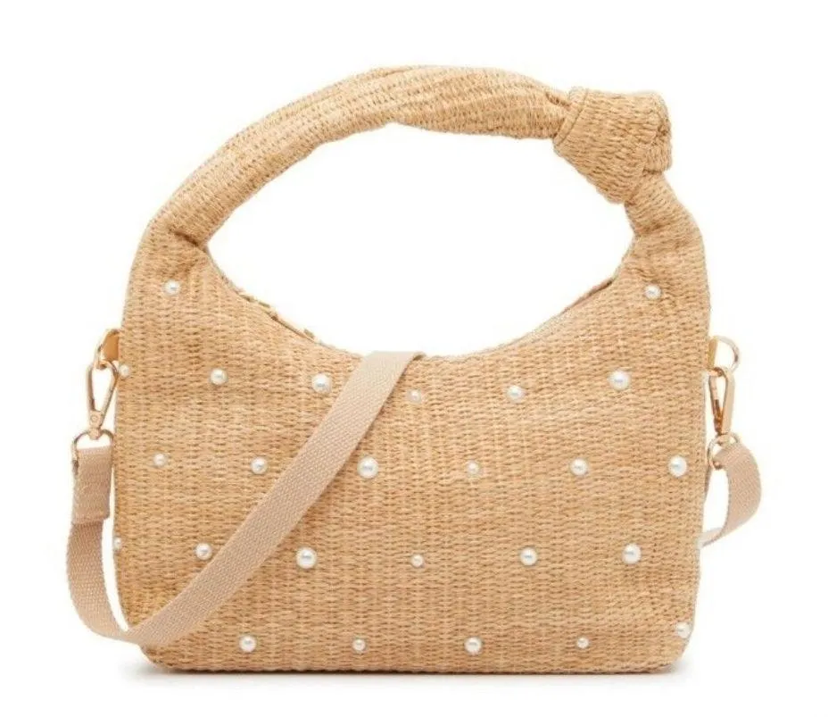 Bring your boho-chic look up a notch with the Seasonal Knot hobo bag from Crown Vintage. Raffia evokes laidback vibes, while pearl beaded highlights shine. : This purse features an effortlessly cool hobo-inspired silhouette, embellished with pearl beaded accents to add some edgy vibes to your look. Raffia Top zipper closure Knotted top handle with 5” drop Removable flat shoulder strap with 26” max. drop Interior pockets: 1 zip Textile lining 10” L x 4” W x 6” H Item # 593423 UPC # 840611194992