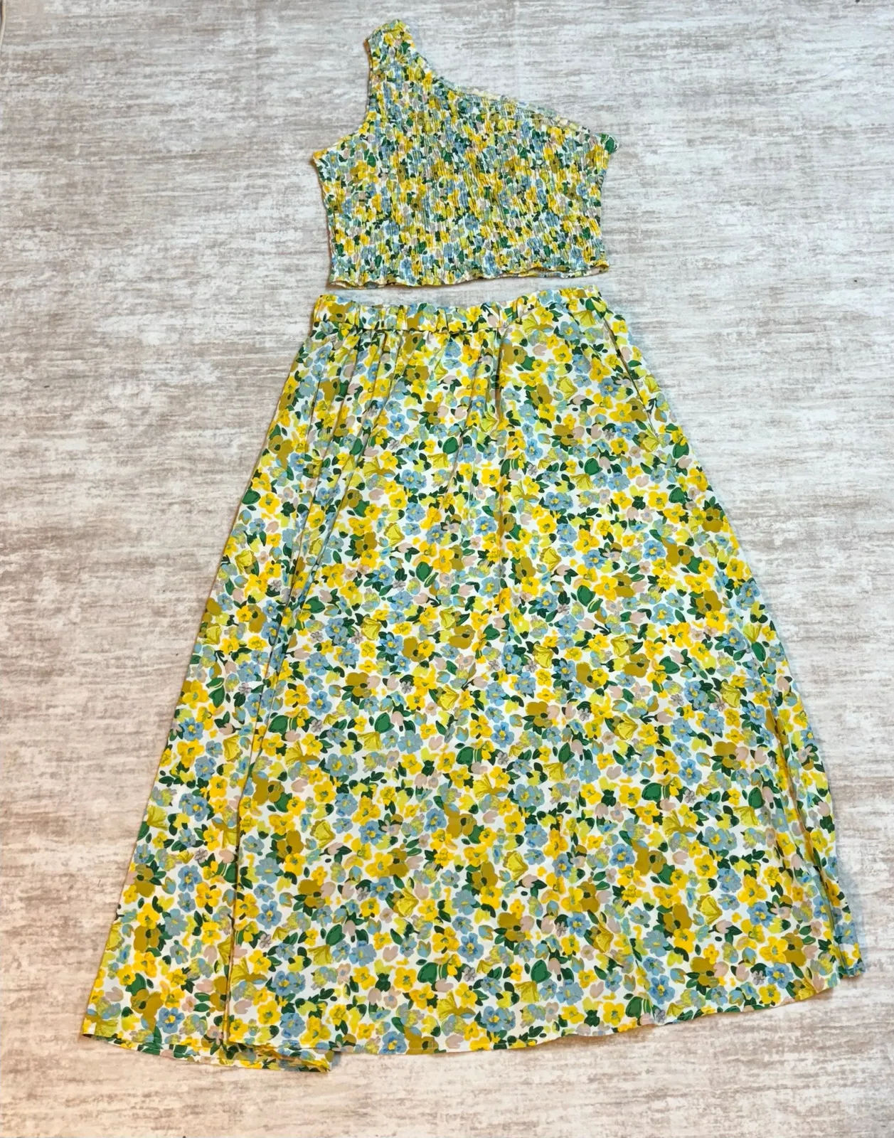 . In great used condition with no issues. Only worn once. Top - fully ruched. Lots of stretch. Can be worn on either the right or left shoulder. No size tag, but came with the XL skirt. Fits me like an XL. Skirt - lined to midi level. Elastic waistband. Side pockets. BTFBM Women’s XL 100% polyester