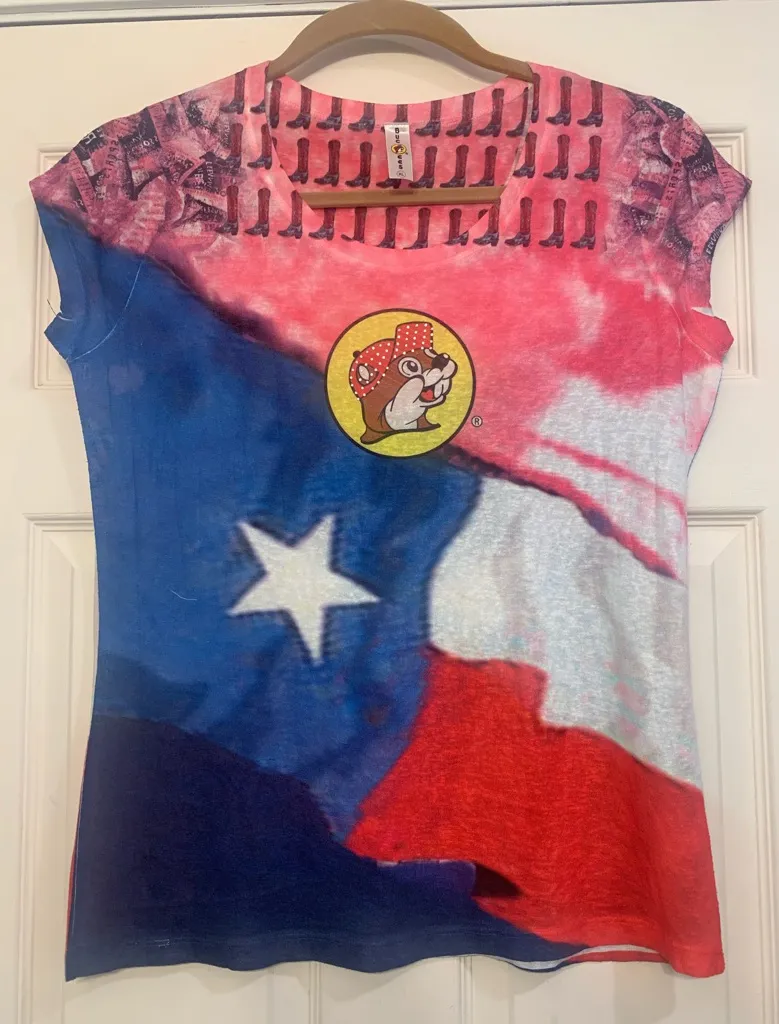 Women’s Red White & Blue Lone Star Flag Printed Shirt. Cropped Short Sleeves. Buc-ee emblem on center of shirt. In like new condition. Size: XL (fitted) Measurements are taken with item lid flat: 22.5” armpit-armpit 19.5” armpit-hem #lonestarstate #texas #bucees Vibrant Texas flag graphic t-shirt with a unique cutout design. Features red, blue, and white colors.