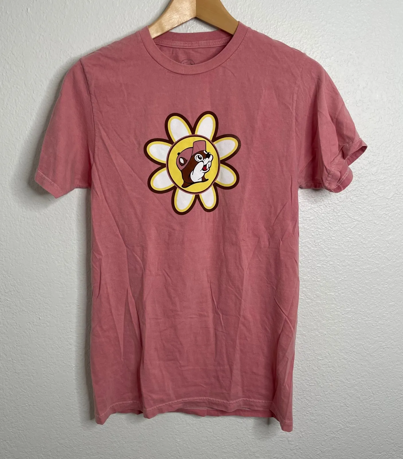 Bucees graphic t shirt in pink featuring a fun roadtrip van design. This short sleeve tee showcases a vibrant yellow van adorned with peace signs flowers and the iconic Bucees beaver. The "Follow Me to Bucees" slogan adds a playful touch. Perfect for casual outings road trips or a fun day at the theme park. Size Small Approximate measurements follow Chest- 17" Length- 26" Keywords: Bucees t shirt, graphic tee, road trip shirt, van life, quirky, casual wear, summer shirt, themed apparel, travel, Texas, fun graphic, cute tee, short sleeve