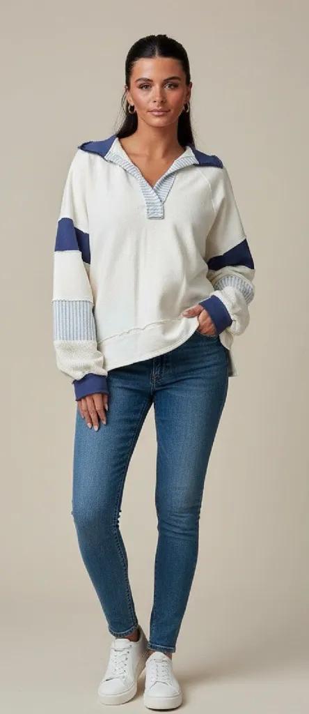 Size Tag removed but fits like a Large Approximate Measurements: Pit to Pit 25”, Front Length 31”, Back Length 33” No rips or stains Brand: Bucket List (or Bucketlist) - Fits Relaxed - Oversized, loose fit, patchworked sweater or sweatshirt with a polo collar - Exposed seams, contrasting navy blue shoulder patches, a striped V-neck and cuffs, and a raw, patchwork hem design. Stylish V-neck sweater with navy accents. Comfortable and chic design.