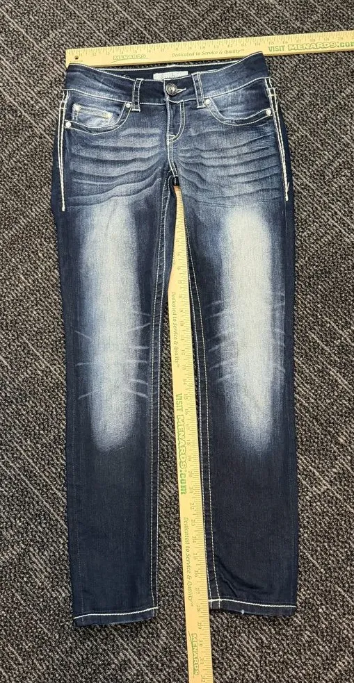 Chic dark blue skinny jeans. Features stylish fading and whiskering. Ideal for casual wear.