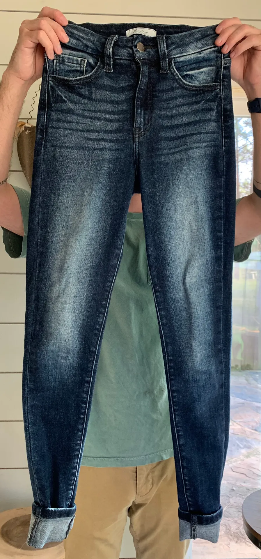 High wasted skinny jeans, I’m short so I always have to cuff them. Make your butt look fantastic!