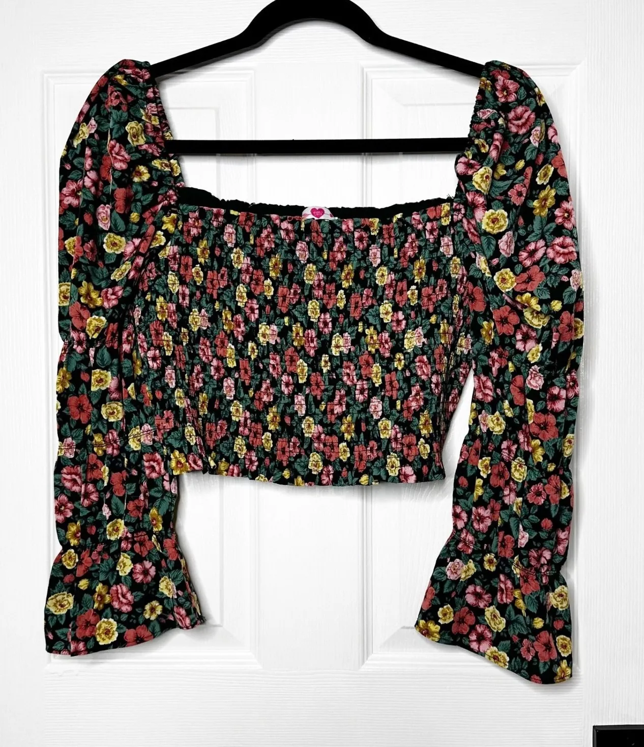 A black floral smocked crop top with bell sleeves. This top features a flattering square neckline an... Show more