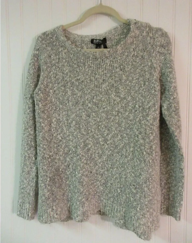 Buffalo by David Britton sweater NWT! Small pullover style gray & white cotton, poly, acrylic & wool Bust 18" across (36" around) Underarm to bottom of sleeve 18" 23"long front 24" back