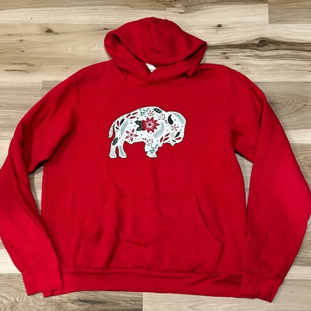 Buffalo Red Floral Holly Graphic Hoodie Sweatshirt Women’s Large No string Measurements- Pit to Pit: 22in Shoulder to Hem: 25in Material: See Photos Shipped next business day. Offers Welcome!