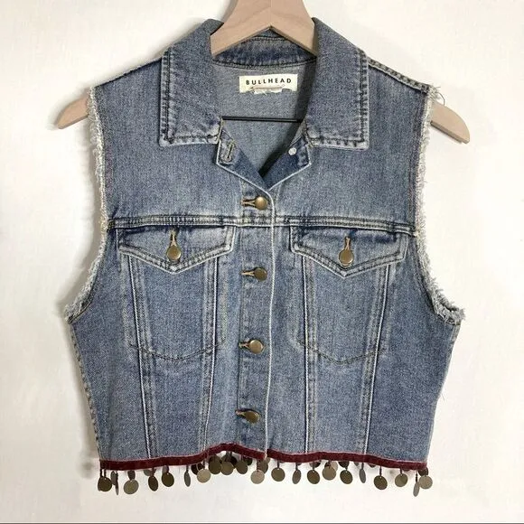 Denim vest by Bullhead. Size medium. Bottom metal disc coin decoration. Button up - Brand: Bullhead - Size: Medium - Denim - Sleeveless Jean jacket / vest - Collared - Raw hem on sleeves - Dangling metal medallion embellishment on the bottom with red velvet - Condition: good preowned Measurements: Armpit to armpit approximately 17” Shoulder to hem approximately 16.5” (17.25” to bottom of embellishment) Smoke free home