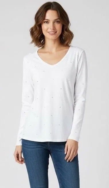 Elevate your wardrobe with the BumbleBella by Jill Martin Long Sleeve Shirt, a perfect blend of comfort and style. Available in a crisp white color, this blouse is tailored to fit a size small, conforming to a classic fit that flatters the silhouette. Constructed with a soft knit of cotton, rayon, and spandex, the shirt promises ease of movement and a stretchy feel for all-day wear. The piece features a timeless crew neck and long sleeves with a fitted design, ensuring a polished look for any casual setting. Delicate rhinestone accents add a touch of sparkle, while the solid pattern keeps it versatile for pairing with any outfit. Suitable for multiple seasons, from the warmth of summer to the cool of winter, this blouse is a staple for a modern city wardrobe. Size Small Ptp: 20” Length: 24.5”