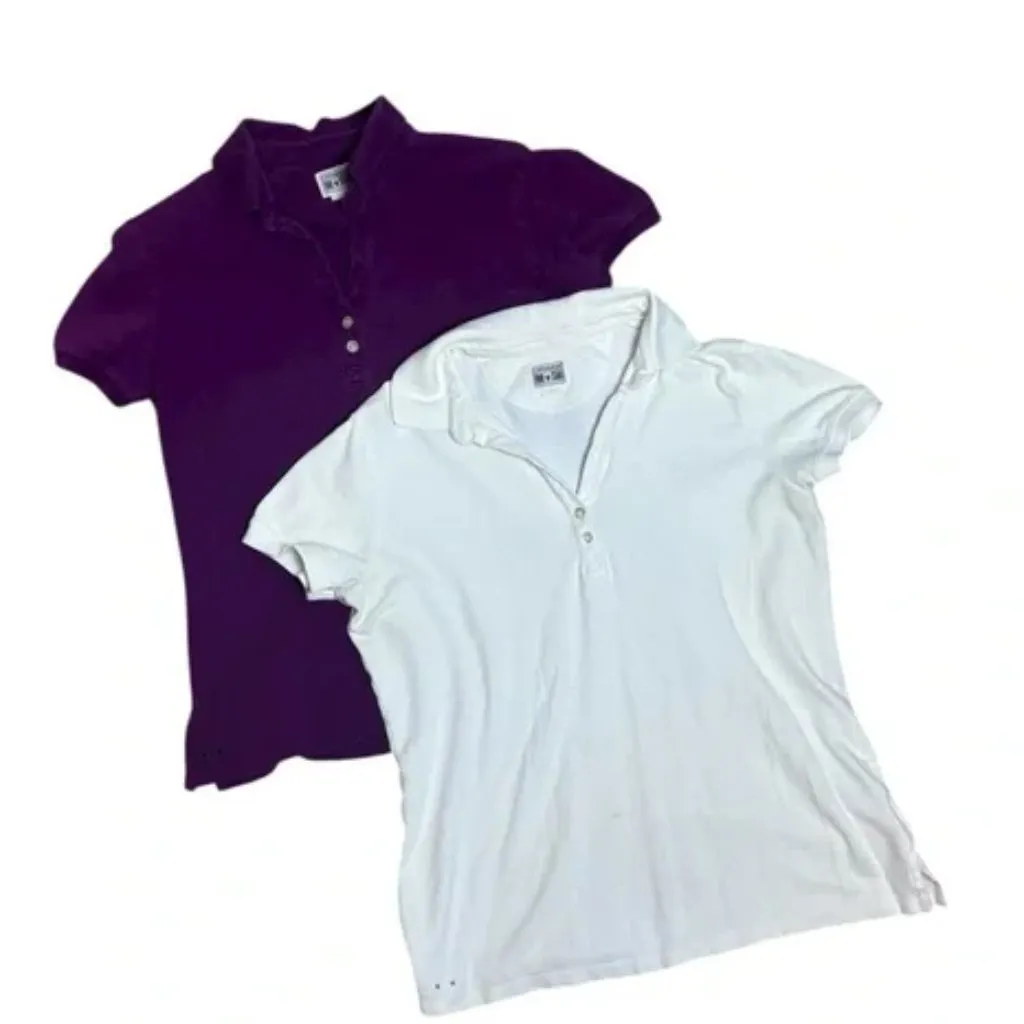 -Lot/Set of two polo shirts in purple and white. Features button-up collars. Experience the timeless appeal of this Converse One Star polo shirt, tailored for a sophisticated yet casual look. The soft cotton fabric offers breathable comfort, while the classic design ensures versatility in your wardrobe. Perfect for layering or standalone wear, this shirt promises comfort and style in every season. • Short sleeves for versatile wear, • Three-button placket for adjustable fit, • Embroidered logo detail, • Side slits for ease of movement. Vintage 90s Y2K style. Soft girl, tennis and golf prep, vintage, school girl, academia inspired. BRAND: Converse One Star SIZE: Both size Large CONDITION: Excellent condition EUC FABRIC CONTENT: Cotton APPROXIMATE MEASUREMENTS: Bust (pit to pit) is about 18 inches. *All items come from a smoke free and pet free home.